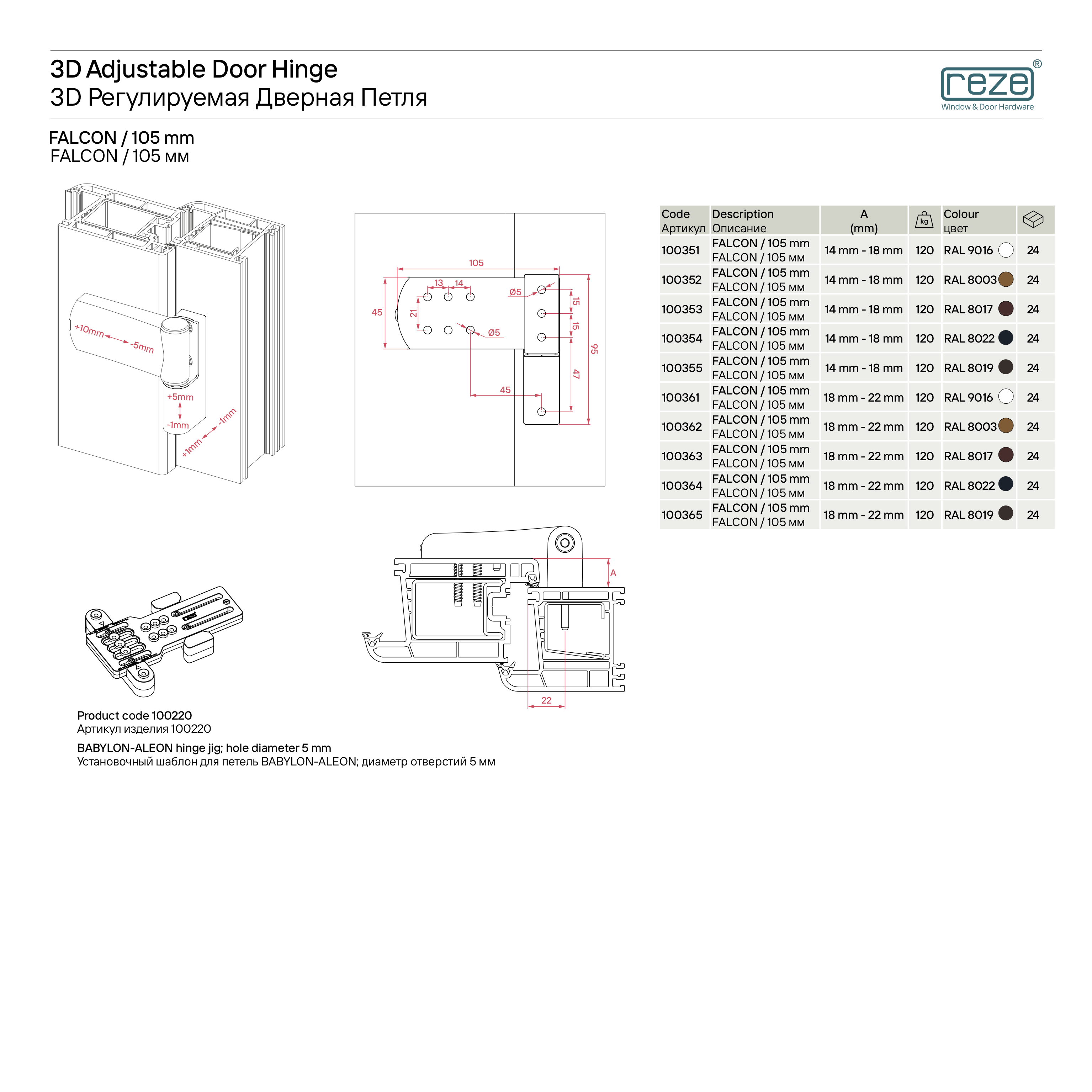 FALCON – PVC Kapı Menteşesirezesite2021-10-18T15:22:36+03:00 RAL 9016RAL 8003RAL 8017RAL 8022RAL 8019 RAL 9016RAL 8003RAL 8017RAL 8022RAL 8019 FALKON 105mm Maksimum kanat taşıma kapasitesi 120 kg Kanat parçası uzunluğu 105 mm Ayarlar: dikey +5/-1 mm; yatay +10/-5 mm; conta baskısı ±1 mm. Kanat bini yüksekliği seçenekleri: 14-18 mm; 18-22 mm ZAMAK alaşımından üretilmektedir . Standart renk seçenekleri: RAL 9016; RAL 8022; RAL 8019; RAL 8017; RAL 8003 Ürün Seçim Tablosu için Tıklayın